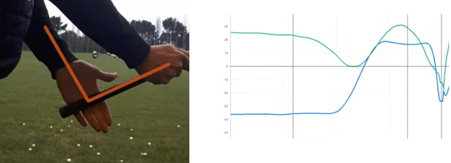 Steven describes an example of a successful tour player, who was experiencing a slight pain on the radial side of the lead wrist in transition. In the graph below his wrist motion data is visible.